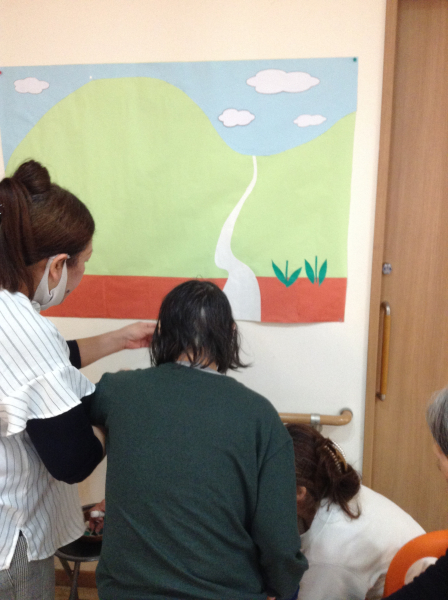 皆さんで壁画の飾りに挑戦!さて何が完成するかな?